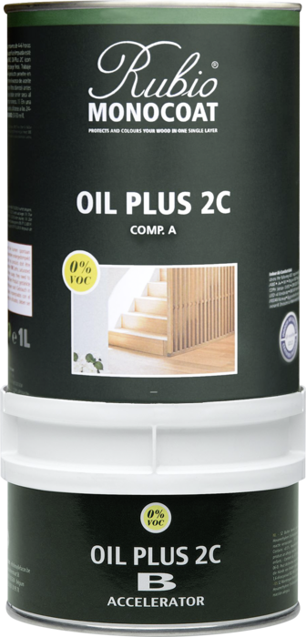 Rubio Monocoat olje plus 2C je proizvod najnovejše generacije. Kombinacija olja za zaščito lesa in pospeševalca sušenja zagotavlja hitro sušenje (v 5dneh). Lahko se uporablja tudi za nego oz. vzdrževanje na vseh oljenih talnih oblogah.